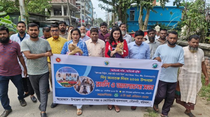 “জলাতঙ্ক নির্মূলে-কাজ করি সবাই মিলে” শ্লোগানকে সামনে রেখে বিশ্ব জলাতঙ্ক দিবস উপলক্ষে বরিশালের গৌরনদীতে র্যালি, আলোচনা সভা ও বিনামূল্যে জলাতঙ্ক টিকা প্রদান করা হয়েছে। গৌরনদী উপজেলা প্রাণিসম্পদ দপ্তর ও ভেটারিনারী